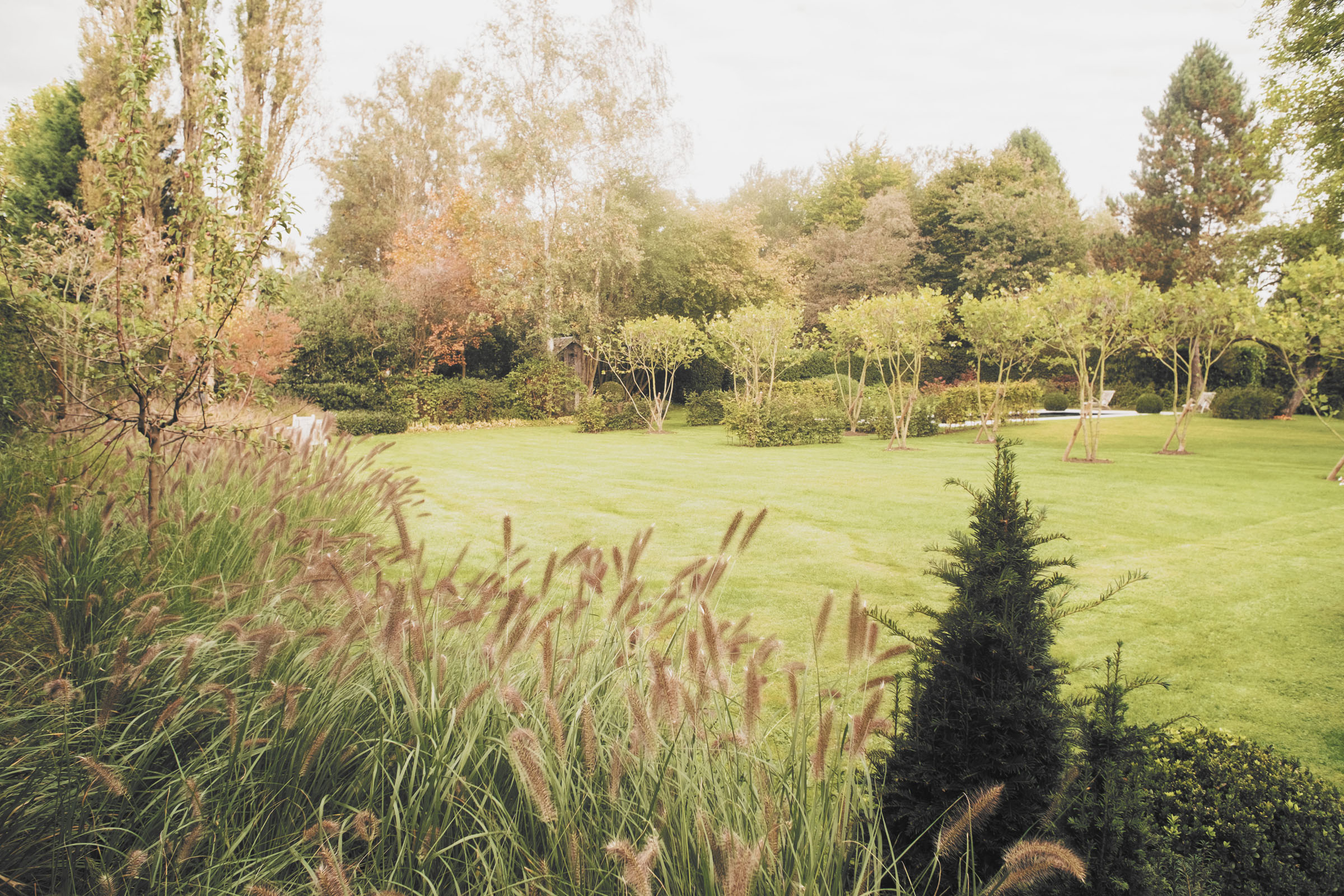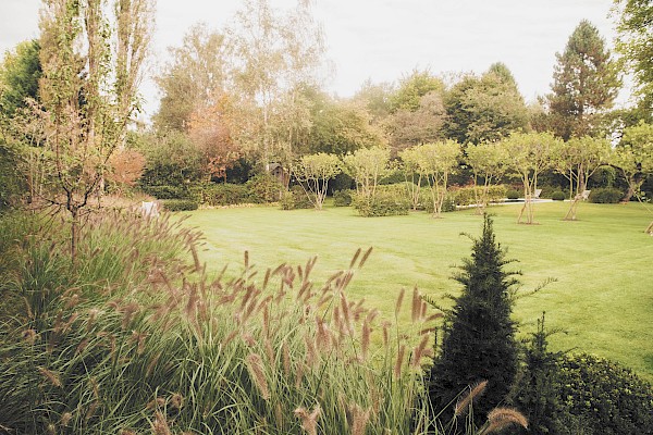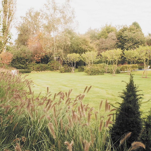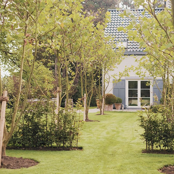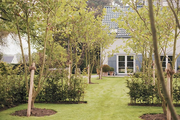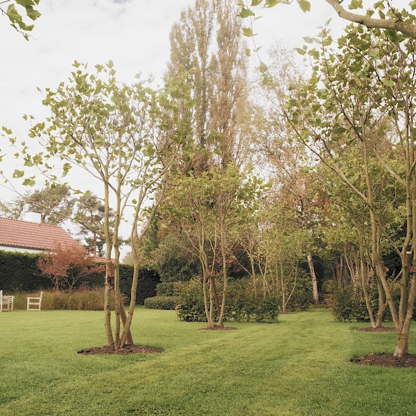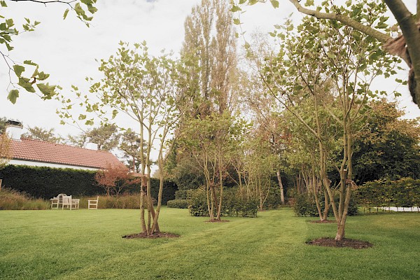 De twee rijen meerstammige Platanus hispanica (gewone plataan) in dakvorm zullen een overdekt wandelpad van het huis naar het zwembad in de tuin vormen. Ze geven een duidelijke structuur aan de tuin. Een Acer palmatum (Japanse esdoorn) brengt kleur in de tuin. Het frisgroene blad contrasteert mooi met de donkere haag van Cupressocyparis leylandii en verkleurt karmijnrood in de herfst. Ook Amelanchier lamarckii (krentenboom) werd aangeplant voor de kleur. Deze bloeit overdadig met witte stervormige bloemen in de vroege lente wanneer het nieuwe blad bronskleurig uitloopt. In de herfst tooit hij zich in prachtige geel-oranje-rode herfstkleuren. Acer campestre 'Elsrijk' werd gekozen voor zijn formele vorm en gele herfstkleur.